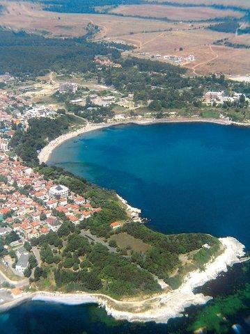 Letecký pohled na část městečka Carevo, ve vrchní části největší pláž Careva..